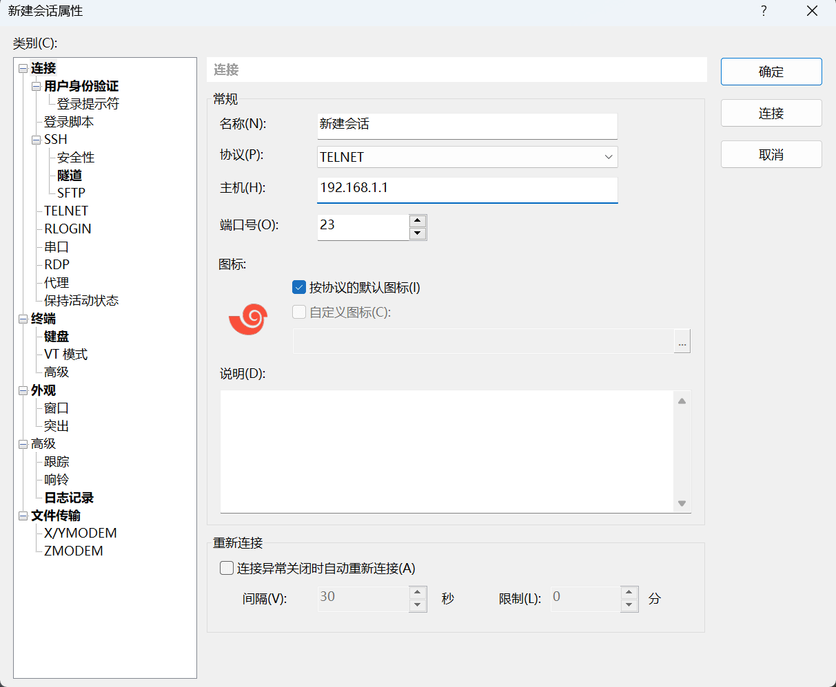 - 新建Telnet会话